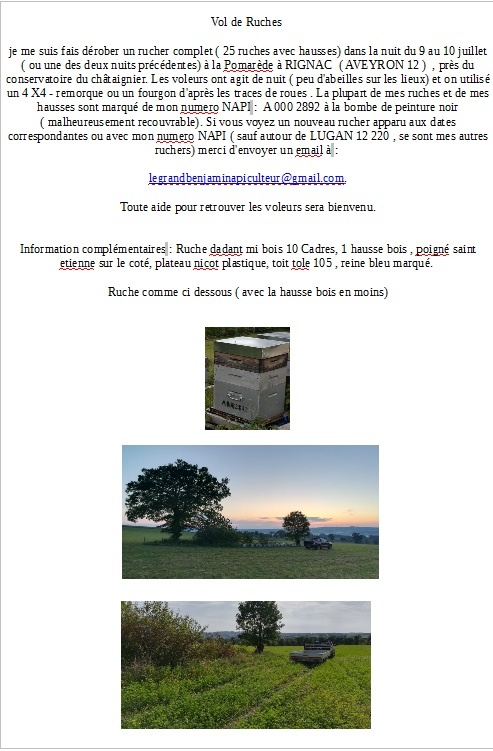 je me suis fais dérober un rucher complet ( 25 ruches avec hausses) dans la nuit du 9 au 10 juillet ( ou une des deux nuits précédentes) à la Pomarède à RIGNAC ( AVEYRON 12 ) , près du conservatoire du châtaignier. Les voleurs ont agit de nuit ( peu d'abeilles sur les lieux) et on utilisé un 4 X4 - remorque ou un fourgon d'après les traces de roues . La plupart de mes ruches et de mes hausses sont marqué de mon numero NAPI : A 000 2892 à la bombe de peinture noir ( malheureusement recouvrable). Si vous voyez un nouveau rucher apparu aux dates correspondantes ou avec mon numero NAPI ( sauf autour de LUGAN 12 220 , se sont mes autres ruchers) merci d'envoyer un email à :