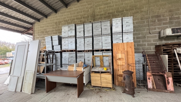 Un stock conséquent est inclus : corps de ruches, hausses, nourrisseurs, toits, cadres et équipements divers.