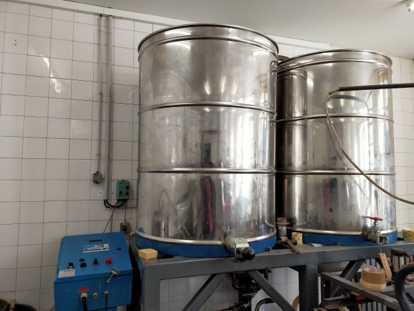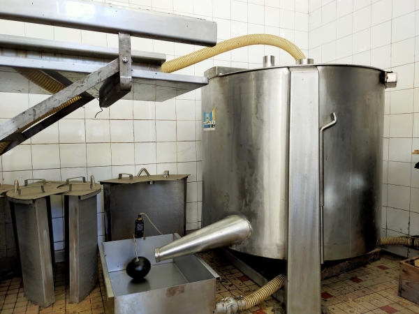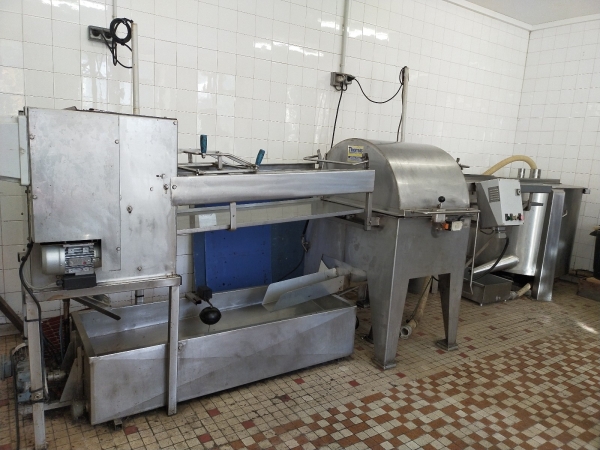 Chaine équipée d'un bac centralisateur double paroi chauffante, d'un Spinomel diamètre 1000, de 2 maturateurs 1000 kg.