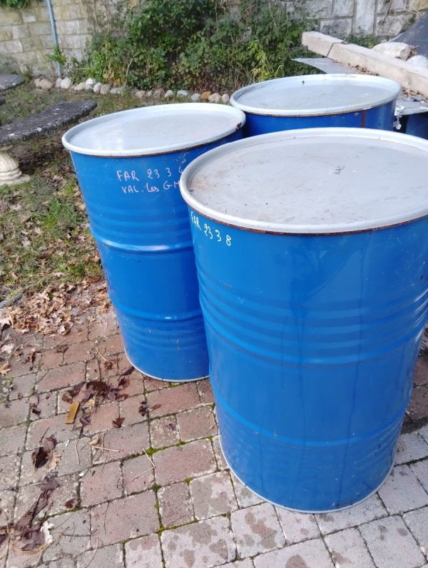 5 futs d'occasion avec couvercles et cerceaux.