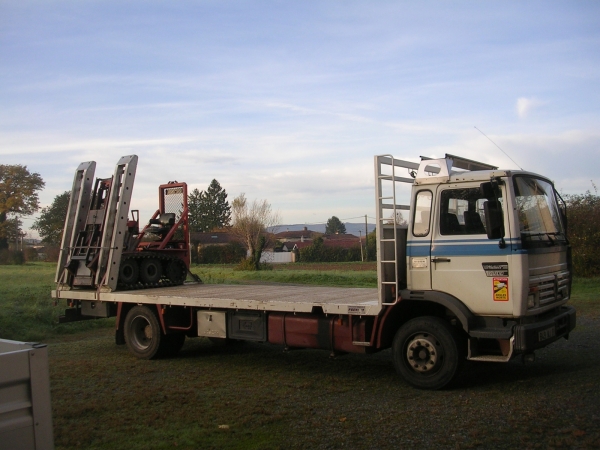 -PL Renault M200 11,5 T (anciennement 13 T) de 1989. Plateau 6.20 m X 2.40 m équipé transhumance (jusqu’à 120 ruches haussées ou 160 ruches corps) rampes articulées pour chargeur, coffres, sangles, cordes.
