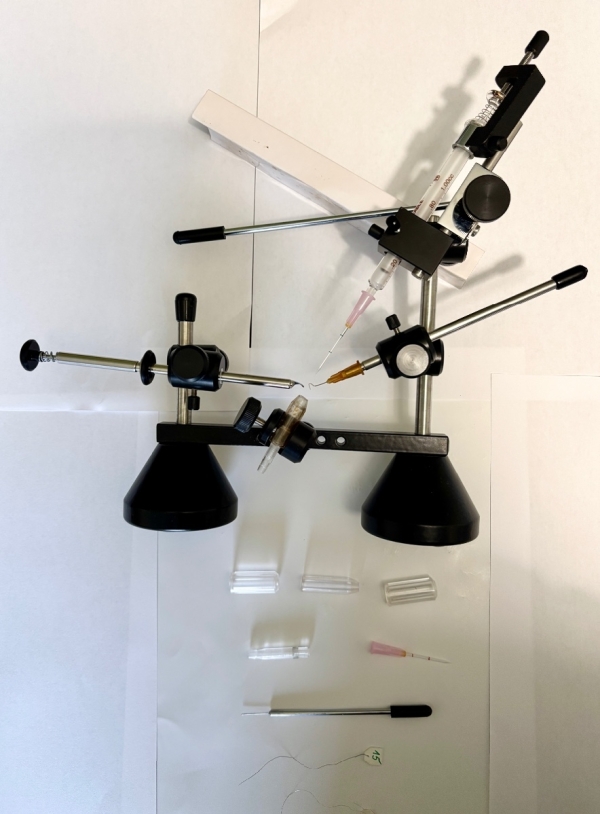 Poste d'insémination de reines Krys Loc vendu avec tube de contention de reines, 2 capillaires, 2 fils de nettoyage capillaire, 2 crochets ventraux, une pince a aiguillon.